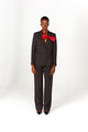 Le blazer cintré présente une coupe structurée qui met en valeur les épaules et la taille, tandis que le pantalon droit assorti allonge la silhouette pour une allure élégante et décontractée. Un nœud rouge éclatant à l'encolure apporte une touche de couleur audacieuse et une note haute couture, transformant un tailleur intemporel en une pièce forte.