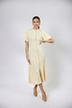 L'abito è impreziosito da eleganti bottoni sul davanti, che aggiungono un tocco di raffinatezza. Le maniche svasate creano un giocoso contrasto, mentre la parte inferiore, lavorata a maglia in modo elaborato, conferisce un tocco moderno a un design classico. Un sottile spacco laterale aggiunge movimento e fascino, rendendolo la scelta ideale per brunch, feste in giardino o uscite serali.