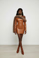 Bold, seductive, and undeniably high-fashion — the Sloane Mini Dress is designed for the woman who owns every room she walks into. Crafted in a rich caramel faux-leather finish, this mini dress contours the body with a sleek, sculpted silhouette that radiates modern glamour.